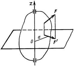 Момент силы относительно оси равен взятому со знаком «плюс» или «минус» произведению модуля проекции силы на плоскость, перпендикулярную этой оси (F'), на кратчайшее расстояние а (плечо) от этой проекции до точки пересечения оси с плоскостью: