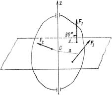 Условимся считать момент положительным, если наблюдатель, смотрящий на плоскость со стороны положительного конца оси, видит возможное вращение плоскости по часовой стрелке. В противном случае – момент отрицательный. Из формулы (18) следует, что момент силы относительно оси равен нулю в двух случаях: если сила параллельна оси (сила F1 рис. 51), т. е. при a = 90° или 270°, когда cos a = 0, и если a = 0, т. е. линия действия силы пересекает ось (сила F2). Момент силы относительно оси будет наибольшим, если a = 0, т. е. сила лежит в плоскости, перпендикулярной оси (сила F3). Тогда Мz(F3) = F3a.