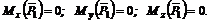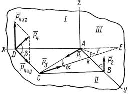 Итак, для равновесия произвольной пространственной системы сил необходимо и достаточно, чтобы алгебраическая сумма проекций всех сил на каждую из трех осей координат равнялась нулю и чтобы алгебраическая сумма моментов всех сил относительно каждой из трех осей координат равнялась нулю. В частном случае, если линии действия всех сил параллельны, выбрав ось z параллельно силам, а оси х и у перпендикулярно силам, получим следующие условия равновесия: