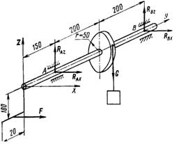 Задача 29. Вал ворота и его рукоятка расположены в одной вертикальной плоскости (рис. 54). Груз G = 500 кН, подвешенный на вороте, удерживается в равновесии горизонтальной силой F, приложенной в середине рукоятки перпендикулярно к ней. Пренебрегая весом вала, определим силу F и реакции подшипников А и В.