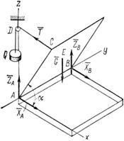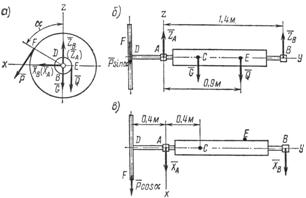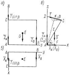 действуют в плоскостях, перпендикулярных к оси у, то реакции шарниров лежат в плоскостях, перпендикулярных к той же оси. Поэтому реакцию шарнира А заменим двумя составляющими и , а реакцию шарнира В – составляющими и
