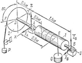 Задача 31. На вал 1 ворота намотана веревка, удерживающая груз Q (рис. 57). Радиус колеса 2 ворота в четыре раза больше радиуса вала. Веревка, прикрепленная к ободу колеса и натягиваемая грузом силой Р = 80 H, сходит с колеса в точке F по касательной; радиус DF колеса образует с вертикалью угол a = 60°. Определить величину груза Q, при котором ворот остается в равновесии, а также реакции подшипников А и В, если общий вес вала и колеса G = 600 Н и приложен в точке С (АС=0,4 м).