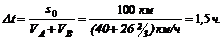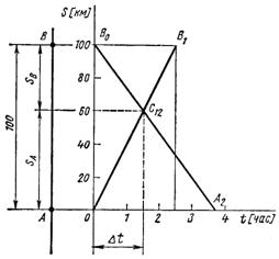 Точка С12 пересечения обоих графиков указывает место и время встречи. Встреча происходит на расстоянии SA = 60 км от пункта А (или на расстоянии SB = 40 км от пункта В) через D t = 1,5 ч после начала движения велосипедистов.
