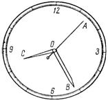 Задача 34. Определить, с какими скоростями движутся точки А, В и С, расположенные на концах секундной, минутной и часовой стрелок часов. Принять длину секундной и минутной стрелок, равную 14 мм, и длину часовой стрелки – 10 мм (рис. 64).