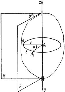 Пусть твердое тело вращается вокруг неподвижной оси Оz (рис. 69). Проведем через ось вращения неподвижную плоскость Q и плоскость Р, жестко связанную с телом. При вращении тела угол j между плоскостями будет непрерывно меняться с течением времени. Его называют углом поворота тела и измеряют в радианах.