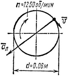 Задача 42. Вал, диаметр которого 0,06 м, вращается равномерно с частотой 1200 об/мин. Определить скорость и ускорение точек вала на его поверхности (рис. 70).