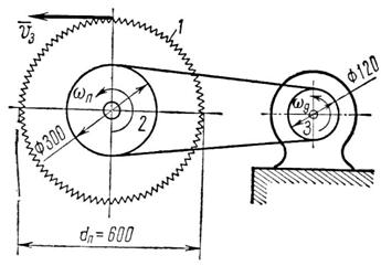 1. Так как пила 1 и шкив 2 насажены на одном валу, то они имеют одну и ту же угловую скорость wп и скорость зубьев пилы V3 = 15 м/с зависит от wп: