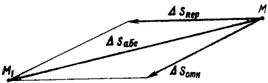 Наклонная плоскость за этот же промежуток времени D t движется прямолинейно относительно Земли, и груз вместе с ней совершает переносное перемещение D Sпер. Изобразим эти перемещения в виде вектора D Sотн и D Sпер, направление которых совпадает с направлениями соответствующих движений. Диагональ параллелограмма, построенного на этих векторах (рис. 73), будет абсолютным перемещением груза из точки М в точку M1. При этом, если переносное и относительное перемещения прямолинейны, абсолютное перемещение