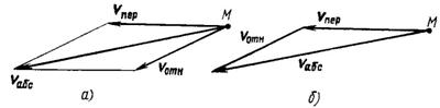 Следовательно, в случае, если относительное и переносное движения прямолинейны, абсолютная скорость точки в каждый момент времени определяется как геометрическая сумма относительной и переносной скоростей. Графически абсолютная скорость точки может быть определена по правилу параллелограмма или треугольника (рис. 74, а и б).