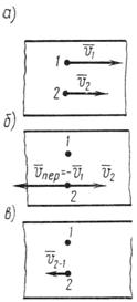 Задача 50. Два автомобиля 1 и 2 движутся параллельно друг другу в одну и ту же сторону со скоростями V1 = 80 км/ч и V2 = 60 км/ч (рис. 77, а). С какой скоростью второй автомобиль двигается относительно первого?