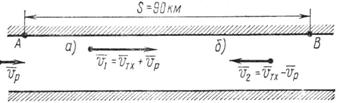 Задача 51. Расстояние S = 90 км между двумя пристанями, расположенными на реке (рис. 78), теплоход проходит без остановки в одном направлении (по течению) за t1 = 3 ч и в обратном направлении (против течения) за t2 = 5 ч. Определить скорость течения реки и собственную скорость теплохода.