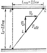 1. Изобразим на рисунке движение лодки (рис. 79). Представим, что лодка отплывает из точки А на правом берегу. Если бы не было течения, она достигла бы противоположного берега в точке В; известно, что ширина реки АВ = lр = 800 м = 0,8 км. Но лодку сносит вниз по течению (переносное движение) на расстояние ВС = lпер = 600 м = 0,6 км и поэтому движение лодки относительно берегов (абсолютное движение) происходит по прямой АС.