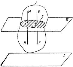 Пусть твердое тело А (рис. 81) движется параллельно неподвижной плоскости I. Пересечем тело плоскостью II, параллельной плоскости I. Получим в сечении фигуру S, которая, перемещаясь вместе с телом, остается все время в плоскости II.