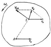 Рассмотрим движение плоской фигуры в своей плоскости (рис. 83). Пусть полюсом служит точка А. Сложное движение фигуры состоит из поступательного вместе с полюсом со скоростью VA и вращательного вокруг этого полюса с угловой скоростью w. Поступательное движение является переносным, вращательное – относительным. Теперь мы можем найти абсолютную скорость любой другой точки тела В как геометрическую сумму двух скоростей: переносной скорости поступательного движения, равной скорости полюса: VBпер = VA, и относительной скорости вращательного движения вокруг полюса: