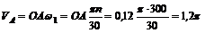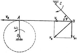1. Шатун механизма АВ совершает плоскопараллельное движение. Выберем в качестве полюса точку А, скорость которой VA направлена перпендикулярно радиусу кривошипа ОА в сторону вращения, модуль последней легко определить из выражения: