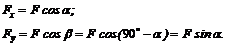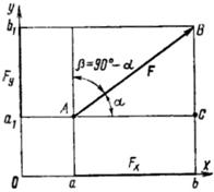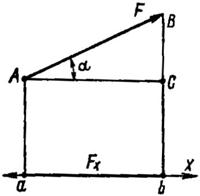 Проекция силы на ось есть величина скалярная. Она может быть положительной, отрицательной или равной нулю в зависимости от величины угла a между направлением силы и положительным направлением оси. Из прямоугольного треугольника ABC следует, что Fx = F сos a, т. е. проекция силы на ось равна произведению модуля силы на косинус угла между направлением силы и положительным направлением оси.