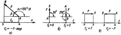 Нетрудно убедиться, что проекция силы на ось будет равна нулю, если a = 90° или 270° (рис. 18, б), и равна модулю силы, если a = 0 или a = 180° (рис. 18, в).