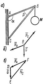 Задача 10. В точке В кронштейна ABC (рис. 20, а) подвешен груз М весом 8 кН. Определить реакции стержней кронштейна, если углы кронштейна a = 110°, b = 30° и крепления в точках А, В и С шарнирные.
