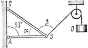 Задача 11. К шарниру В кронштейна ABC прикреплена веревка, перекинутая через блок, к другому концу которой прикреплен груз весом G = l,5 кН (рис. 22). Определить усилия в стержнях АВ и СВ кронштейна, если крепления в точках А и С шарнирные, a = 35° и b = 100°.