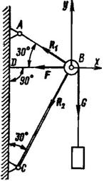 Задача 12. На оси шарнира В (рис. 23) шарнирно-стержневой системы ABC свободно вращается блок. Через блок перекинута нить, с помощью которой удерживается груз весом G = 50 Н. Определить усилия в стержнях АВ и ВС. При этом диаметром блока и трением нити можно пренебречь.