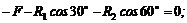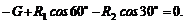 Учитывая, что F = G = 50 H, и решая совместно оба уравнения, получим R1 = – 18,6 H; R2 = – 68,5 Н. Здесь знаки «минус» указывают, что стержни АВ и ВС сжаты, а не растянуты, как мы предполагали заранее.