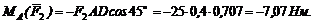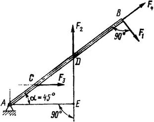 2. Момент силы F2 относительно точки А отрицательный, так как сила F2 стремится вращать тело АВ против часовой стрелки. Из треугольника ADE плечо силы F2 АЕ = AD cos 45°, следовательно,