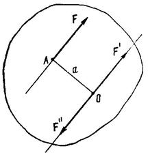 Доказательство: Пусть сила F приложена к телу в точке А (рис. 28). Приложим в центре О две равные и противоположно направленные силы: F' и F". Согласно 2-й аксиоме при этом механическое состояние тела не изменится. Пусть модули всех сил равны: F = F' = F". Тогда полученную систему из трех сил можно представить как пару (F, F") и силу F', которую можно рассматривать как перенесенную из точки А в точку О силу F. Нетрудно убедиться, что момент пары (F, F")