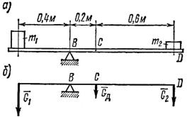 1. Рассматривая доску как рычаг, видим, что на нее действуют три нагрузки: вес левого груза G1 = mlg, вес правого груза G2 = m2g и собственный вес доски Gд = mдg (рис. 34, б).