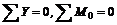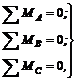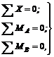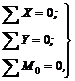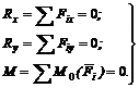 т. е. алгебраическая сумма проекций всех сил системы на ось х равна нулю; алгебраическая сумма проекций всех сил системы на ось у равна нулю; алгебраическая сумма моментов всех сил системы относительно любой точки равна нулю.
