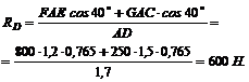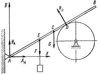 Задача 19. Однородный брус АВ (рис. 36) весом G = 250 Н прикреплен к стене при помощи шарнира А и в точке D опирается на гладкий цилиндр. В точке Е к брусу подвешен груз Р = 800 Н. Определить реакцию цилиндра и шарнира, если АЕ = 1,2 м; АС = ВС = 1,5 м; AD = 1,7 м и Ð ВАх = a = 40°.