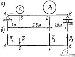 Задача 20. На горизонтальную балку АВ, левый конец которой имеет шарнирно-неподвижную опору, а правый – шарнирно-подвижную, в точках С и D поставлены два груза: P1=10 кН и P2 = 20 кH (рис. 37, а). Определить реакции опор балки.