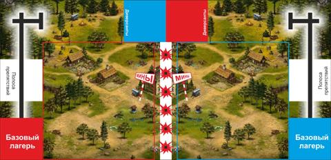 · Игровое поле ограничено рамкой красного цвета и разделено линией фронта на две равные зоны для сил противников. В каждой половине поля имеются зоны: «базовый лагерь», «диверсант». Размер зоны «базовый лагерь» составляет 30х30 см.