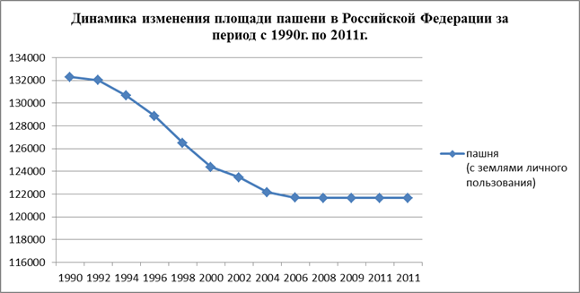 За последние 20 лет произошло катастрофическое уменьшение площадей пашен во всей Российской Федерации (Рисунок 9 - Динамика изменения площади пашни в Российской Федерации за период с 1990г. по 2009г. В целом, с 1990 по 2009 годы площадь сельскохозяйственных угодий уменьшилась на 1,9 млн. га, сокращение площади земель, используемых под пашню, составило более 10,8 млн. га (Таблица 16). В то же время площадь земель под сенокосами и пастбищами увеличилась на 4,2 млн. га, а под залежью – на 4,6 млн. гектар.