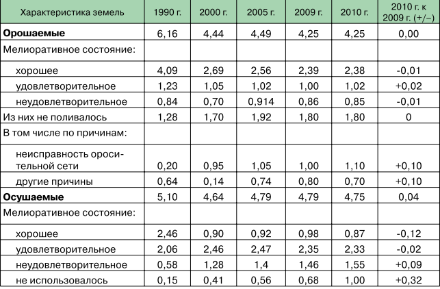 Таблица 18 - Динамика площадей мелиорированных земель с 1990 по 2010 гг. (млн. га)