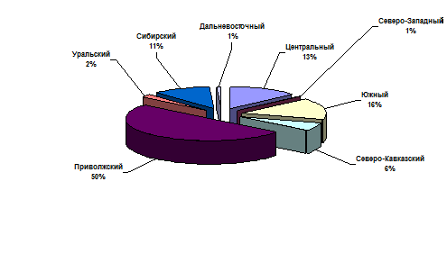 Наиболее опасными в эрозионном отношении являются территории Приволжского (50,0%), Южного (16,0%) и Центрального (13,0%) федеральных округов (рис.3-5), в дефляционноопасном – Сибирского (43,0%) и Южного (30,0%) федеральных округов (рис.3-6). Процессы заболачивания в наибольшей степени развиты на территории Центрального (31,0%) и Сибирского (23,0%) федеральных округов (рис.3-7), засоления – Южного (около 50,0%) и Сибирского (примерно 30,0%) федеральных округов (Рисунок 11).