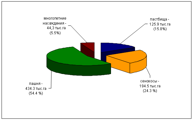 В структуре сельскохозяйственных угодий на долю пашни (434,3 тыс. га) приходится 54,4%. Природные кормовые угодья (сенокосы и пастбища) занимают 320,4 тыс. га (40,1%), многолетние плодовые насаждения – 44,3 тыс. га (5,5%) (Рисунок 15).