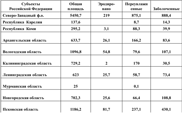 Земли ленинградской области подвержены процессам деградации земель. Так, по данным переувлажненные и заболоченные почвы на сельскохозяйственных угодьях округа занимают 32,4%. Переувлажнение и заболачивание проявляется в основном на сенокосах – 50,7% их площади, пастбищах – 38,8% площади, пашне – 23,9% площади. Причем процессы заболачивания, представляющие наибольшую опасность для почвенного покрова и состояния сельскохозяйственных угодий, в округе преобладают над процессами переувлажнения [114].
