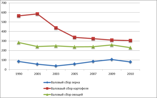 Согласно проведенному нами анализу была выявлена закономерность снижения валового сбора основных видов растениеводческой продукции на территории Ленинградской области за последние 20 лет (Рисунок 17).
