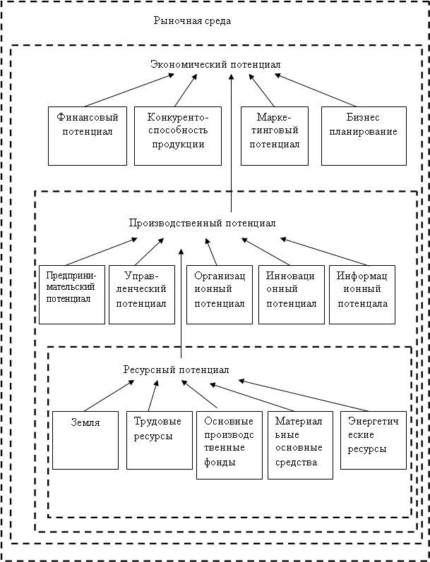 Рисунок 2 – Взаимодействие ресурсного, производительного и экономического потенциалов в иерархии рыночных отношений