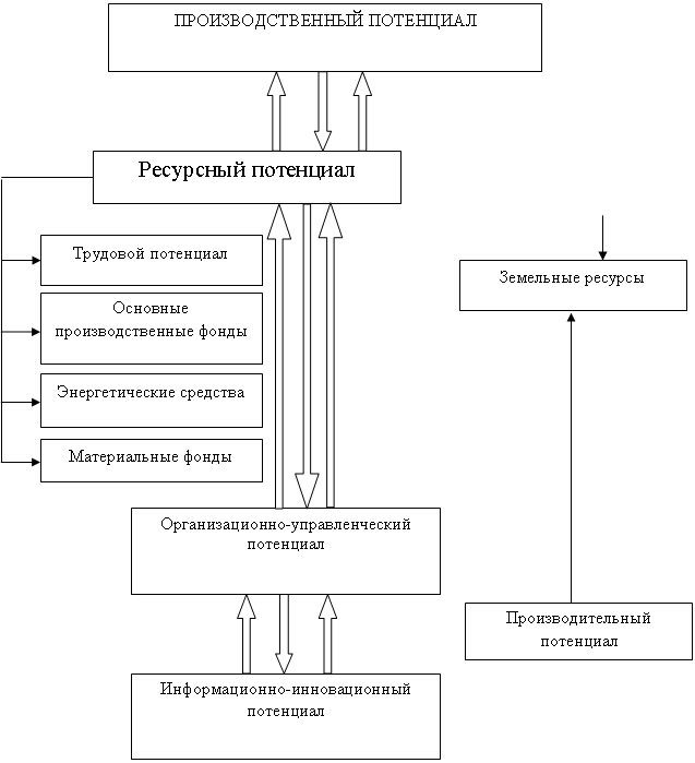 Производственный потенциал формируется в первую очередь из ресурсов, который являются содержанием ресурсного потенциала. Ресурсный потенциал можно характеризовать как процесс обеспечения предприятий необходимыми материально-денежными ресурсами. Ресурсный потенциал сельскохозяйственного предприятия включает в себя: