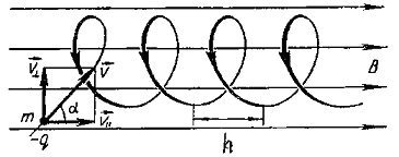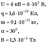 Задача 12. Электрон, ускоренный разностью потенциалов 6 кВ, влетает в однородное магнитное поле под углом 300 к направлению поля и начинает двигаться по спирали. Индукция магнитного поля равна В =