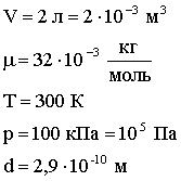 Задача 3. Определить среднюю длину свободного пробега молекул и число соударений за 1 с, происходящих между всеми молекулами кислорода, находящегося в сосуде емкостью 2 л при температуре 27оС и давлении 100 кПа.