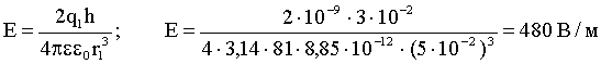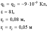 Задача 1. Два равных отрицательных заряда по 9 нКл находятся в воде на расстоянии 8 см друг от друга. Определить напряженность и потенциал поля в точке, расположенной на расстоянии 5 см от зарядов.