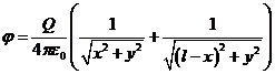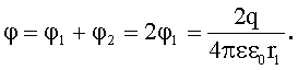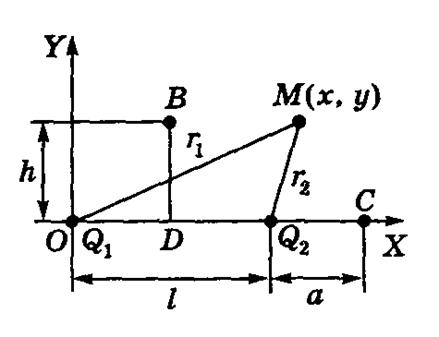 Решение: Электростатическое поле создается двумя точечными зарядами. В любой точке пространства потенциал результирующего поля может быть найден по принципу суперпозиции: