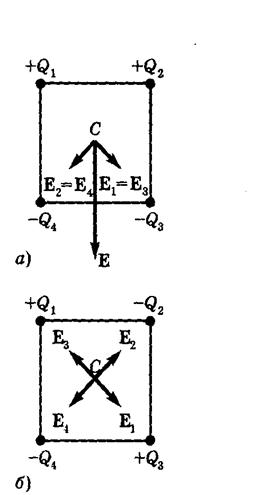 расположения положительных и отрицательных зарядов в вершинах квадрата.