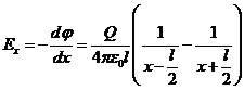 Симметричность условий распределения заряда позволяет сделать вывод, что в точках, лежащих на оси OX, вектор напряженности электростатического поля направлен вдоль этой оси. Тогда на основе связи напряженности и потенциала имеем: