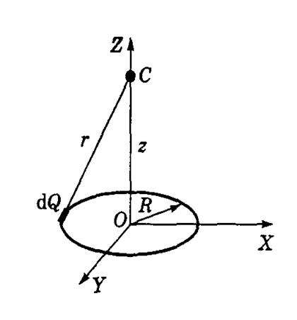 Решение. Сделаем рисунок, соответствующий условию задачи – рис.6. Поле создано зарядом, распределенным по тонкому кольцу заданного радиуса. Указать точно геометрию силовых линий создаваемого таким зарядом поля трудно. Поэтому для определения напряженности и потенциала поля используем принцип суперпозиции. Разобьем кольцо на элементарные точечные участки, которые имеют заряд