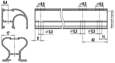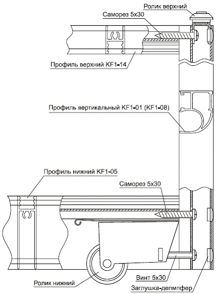 • для крепления роликов и профилей между собой, сверлятся отверстия в стойках KF1-01 и KF1-02 согласно рис.6. Для KF1-01 на рисунке изображен правый вертикальный профиль, левый профиль – зеркально.