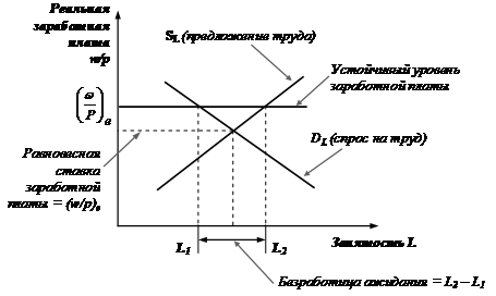 Устойчивость (жесткость) заработной платы порождает "безработицу ожидания", которая возникает в результате превышения уровня реальной заработной платы над ее равновесным значением (рис. 1).