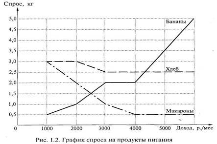 Задание. В результате маркетинговых исследований получена следующая зависимость спроса на продукты питания за месяц в семьях с различным среднедушевым доходом (табл. 4). Построить график спроса на эти продукты питания (рис. 1.2). Сделать выводы.